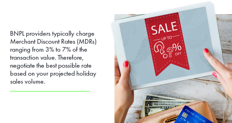 • Fees and Pricing – BNPL providers typically charge Merchant Discount Rates (MDRs) ranging from 3% to 7% of the transaction value. Therefore, negotiate the best possible rate based on your projected holiday sales volume. Also, make sure you understand all associated fees, including refund processing costs, so you can accurately forecast your profit margins.