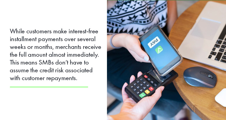 While customers make interest-free installment payments over several weeks or months, merchants receive the full amount almost immediately. This means SMBs don’t have to assume the credit risk associated with customer repayments.