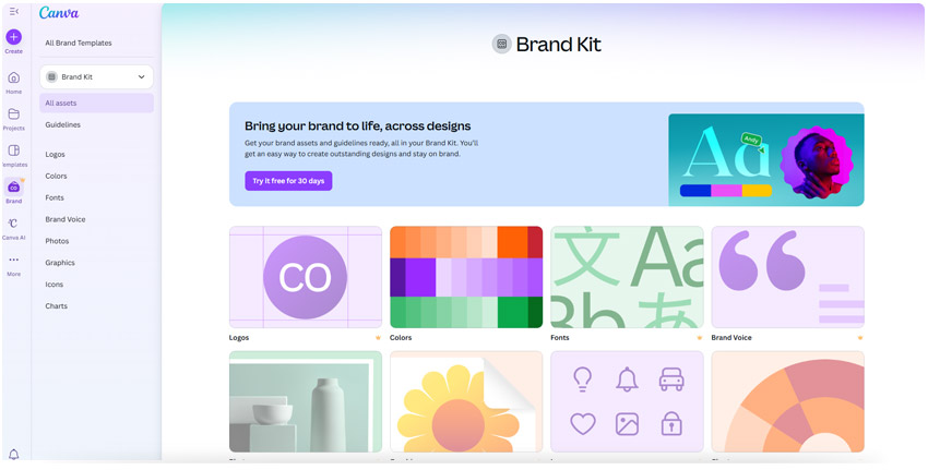 - Brand Kits – Store your logos, fonts, and colors in one place to keep your brand consistent and save time across all projects.