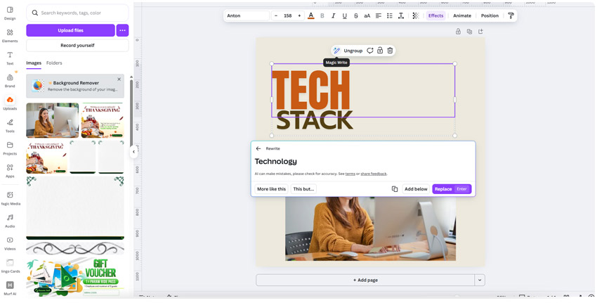 - Magic Replace – Instantly update logos, colors, or fonts across multiple designs, making rebranding or design updates effortless.