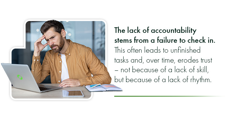 The lack of accountability stems from a failure to check in. This often leads to unfinished tasks and, over time, erodes trust – not because of a lack of skill, but because of a lack of rhythm.