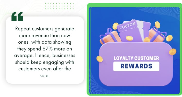 Repeat customers generate more revenue than new ones, with data showing they spend 67% more on average. Hence, businesses should keep engaging with customers even after the sale.